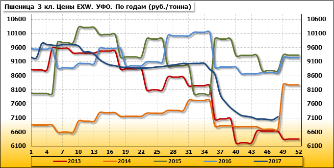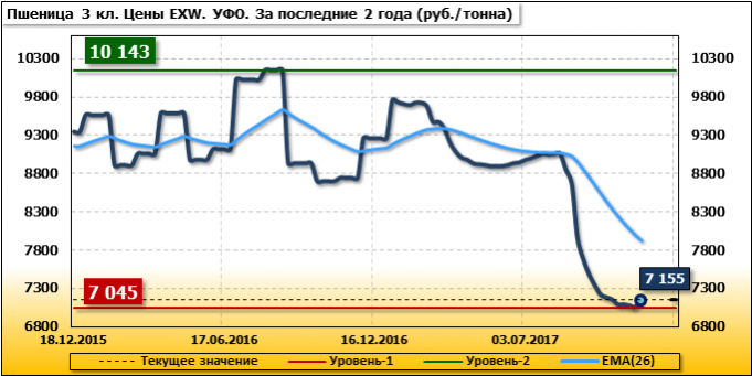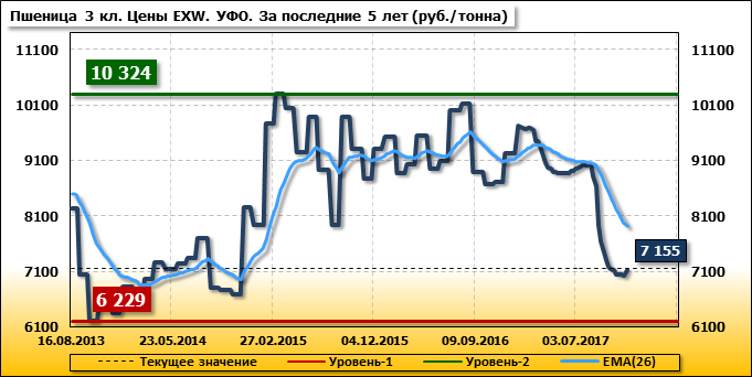 Внутренние цены на пшеницу 3 класса в Уральском федеральном округе выросли на 110 руб./т. и на данный момент составляют 7 155 рублей за тонну.