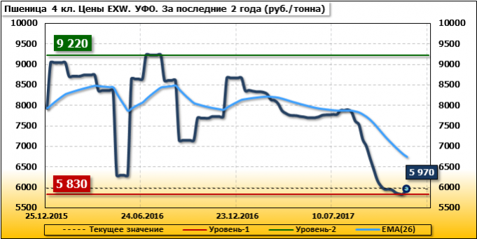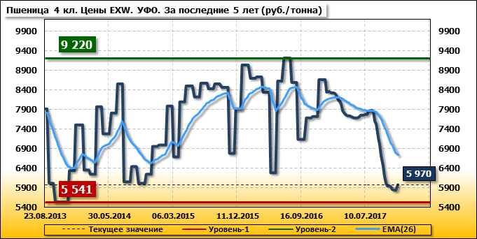 Цены на пшеницу 4-го класса поднялись на 140 руб./т. и на данный момент составляют 5 970 рублей за тонну.