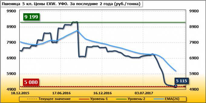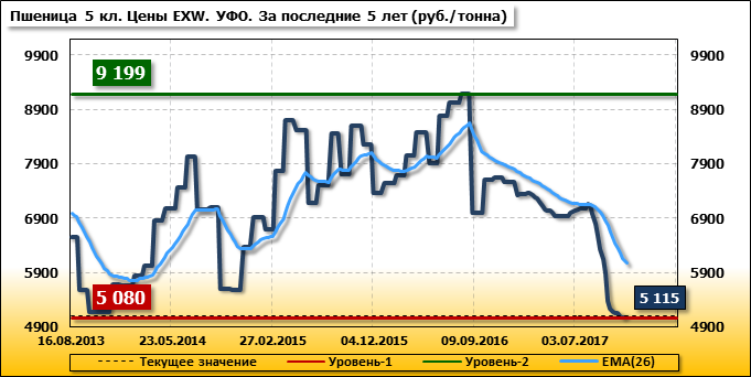 Цены на пшеницу 5-го класса повысились на 35 руб./т. и на данный момент составляют 5 115 рублей за тонну.