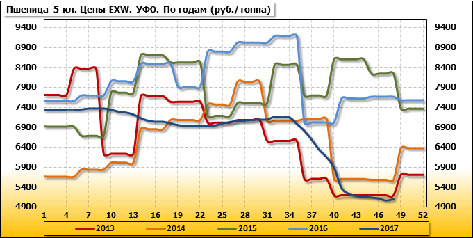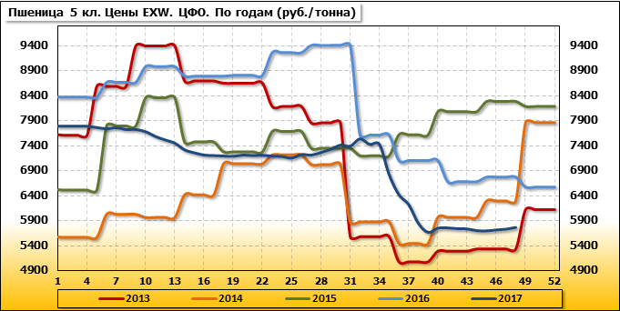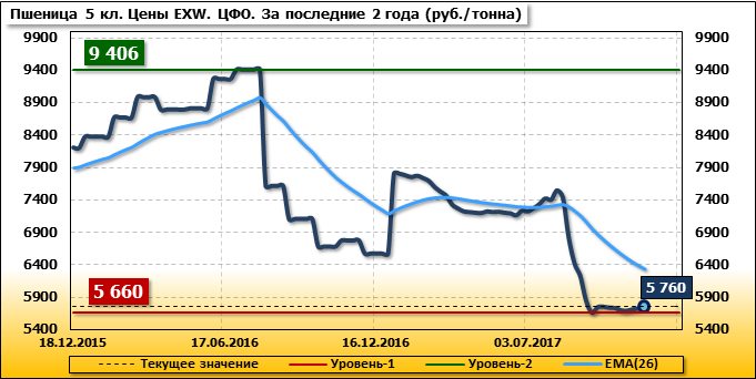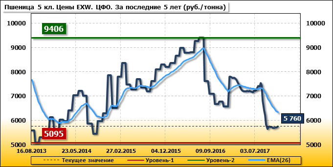 Цены на пшеницу 5-го класса повысились на 35 руб./т. и на данный момент составляют 5 760 рублей за тонну.