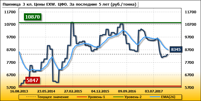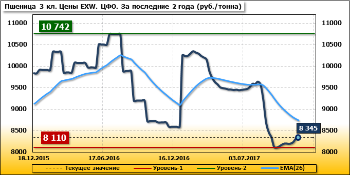 За прошедшую неделю в Центральном федеральном округе внутренние цены на пшеницу 3 класса выросли на 35 руб./т. и на данный момент составляют 8 345 рублей за тонну.