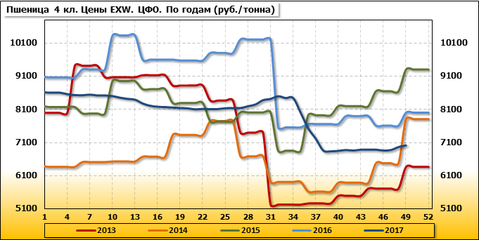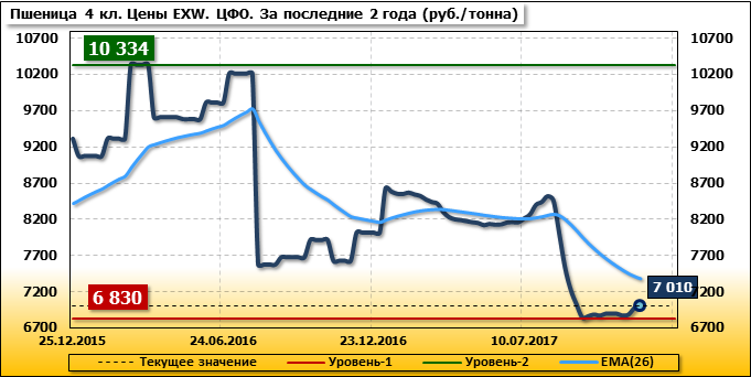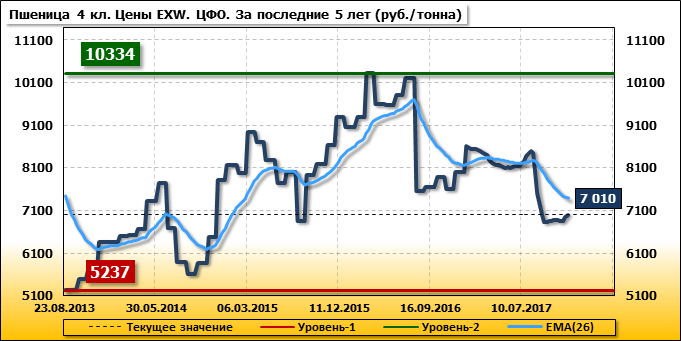 Цены на пшеницу 4-го класса поднялись на 50 руб./т. и на данный момент составляют 7 010 рублей за тонну.
