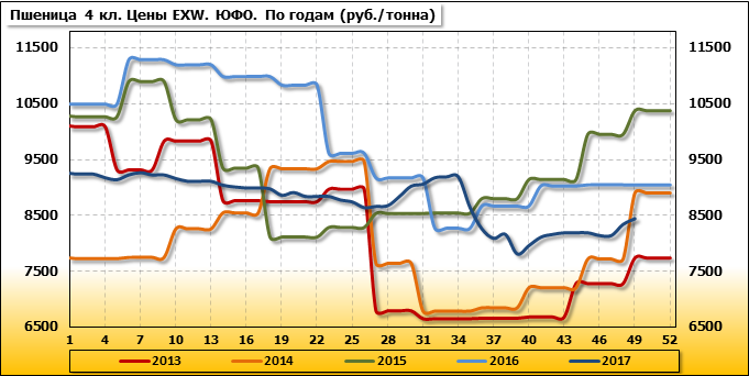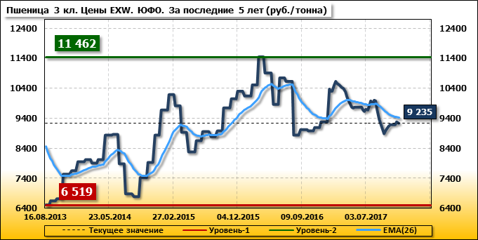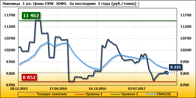 В Южном федеральном округе внутренние цены на пшеницу 3 класса упали на 50 руб./т. и на данный момент составляют 9 235 рублей за тонну.