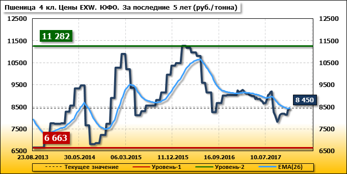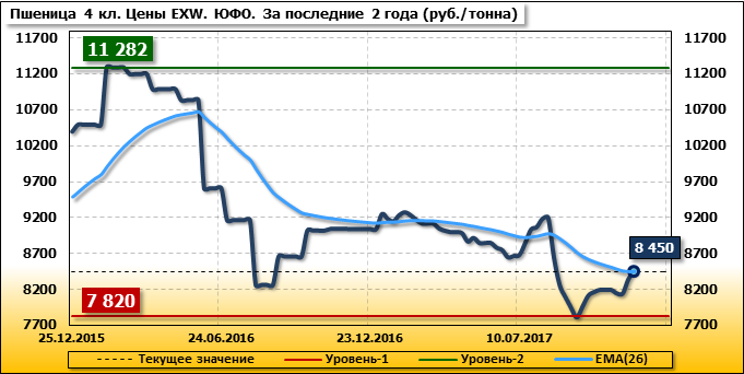 Цены на пшеницу 4-го класса поднялись на 100 руб./т. и на данный момент составляют 8 450 рублей за тонну.