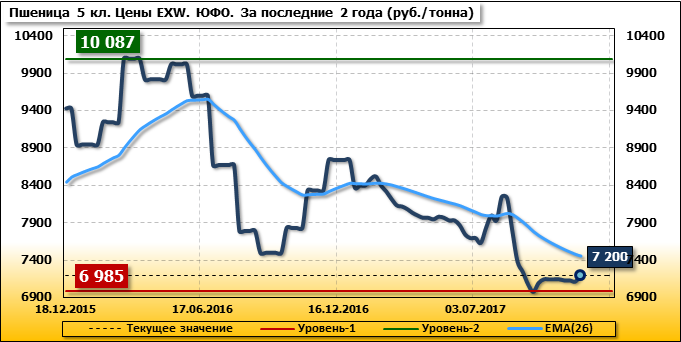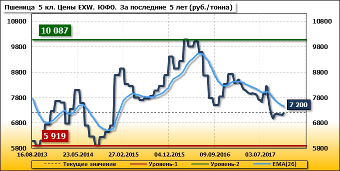 Цены на пшеницу 5-го класса повысились на 80 руб./т. и на данный момент составляют 7 200 рублей за тонну.