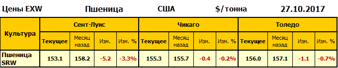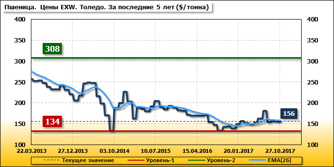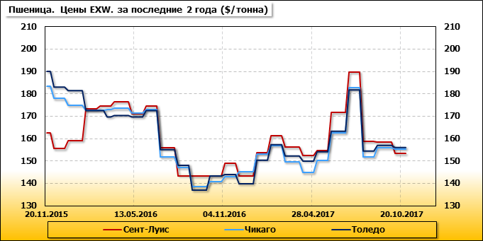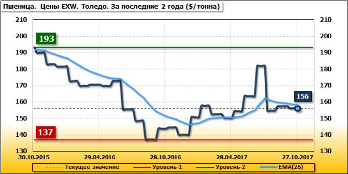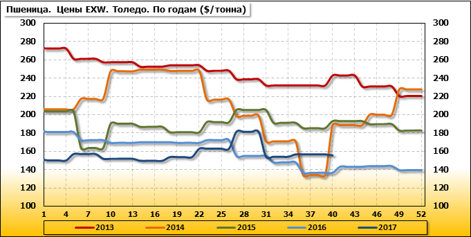 Внутренние цены на пшеницу SRW в городе Толедо (США) упали на 1.1 $/т. и на отчетный месяц составляют 156.03 доллара за тонну.