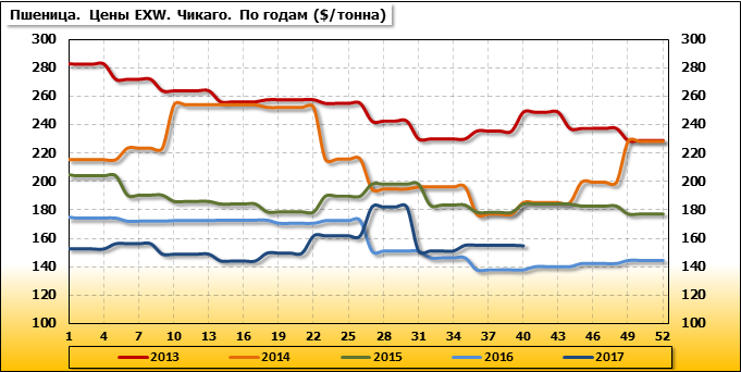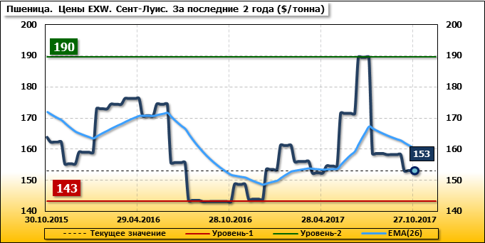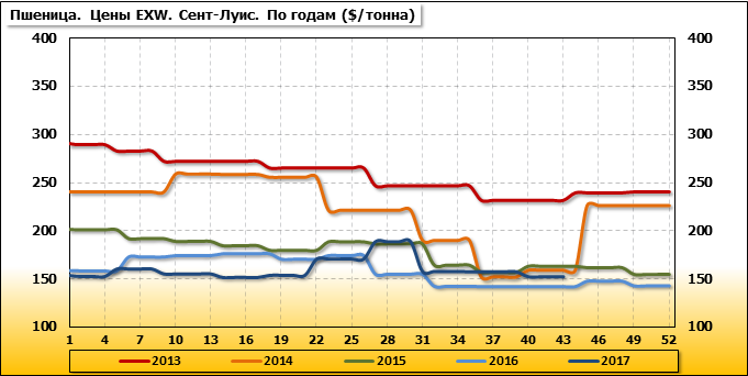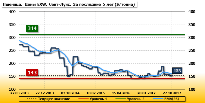 За прошедшую неделю внутренние цены на пшеницу SRW в Сент-Луис (США) упали на 5.2 $/т. и на отчетный месяц составляют 153.09 доллара за тонну.