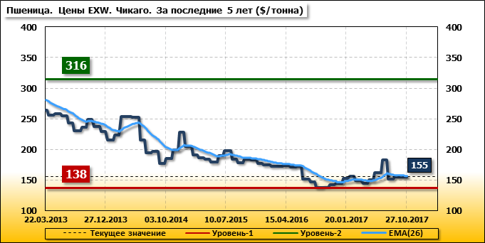 В Чикаго (США) внутренние цены на пшеницу SRW упали на 0.4 $/т. и на отчетный месяц составляют 155.3 доллара за тонну.