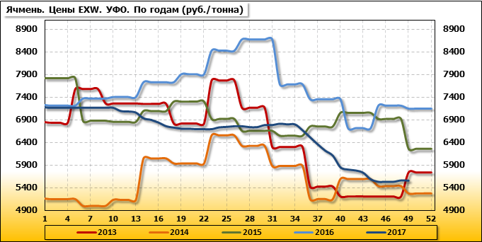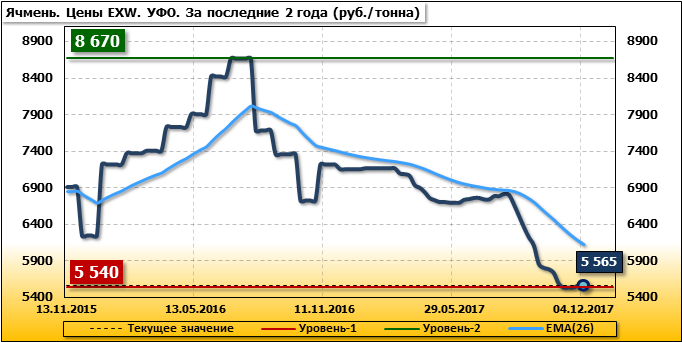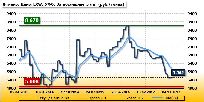 Внутренние цены на ячмень в Уральском федеральном округе упали на 5 руб./т. и на данный момент составляют 5 565 рублей за тонну.