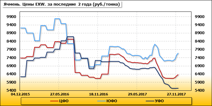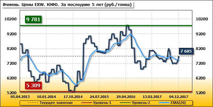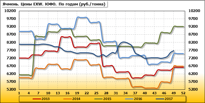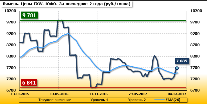 В Южном федеральном округе внутренние цены на ячмень выросли на 115 руб./т. и на данный момент составляют 7 685 рублей за тонну.