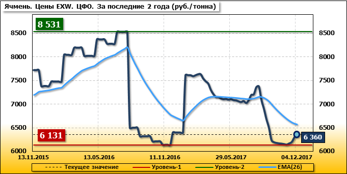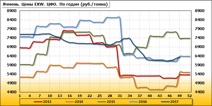 За прошедшую неделю в Центральном федеральном округе внутренние цены ячмень выросли на 75 руб./т. и на данный момент составляют 6 360 рублей за тонну.