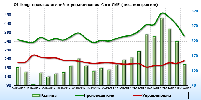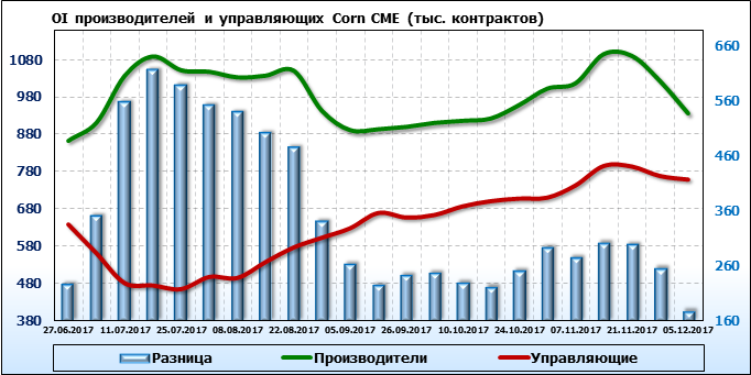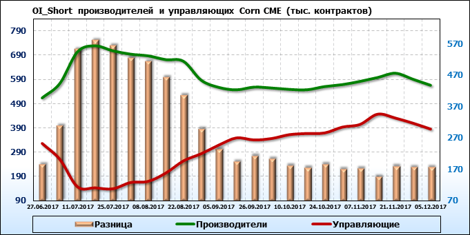 За прошедшую неделю разница между OI производителей и OI управляющих сократилась на 78 293 контракта. Разница между длинными позициями производителей и управляющих сократилась на 77 471 контракт. Разница между короткими позициями производителей и управляющих сократилась на 230 контрактов.