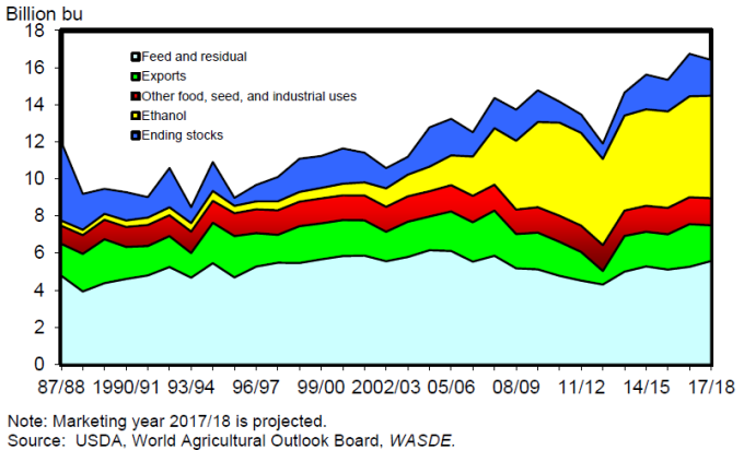 Рисунок 1. Потребление кукурузы в США: на корм и остаточные продукты, экспорт, использование в производстве продуктов питания, семян и промышленности (FSI), этанол, конечные запасы.