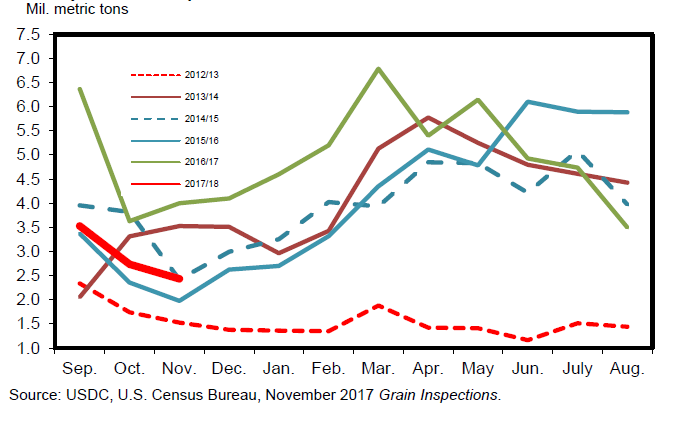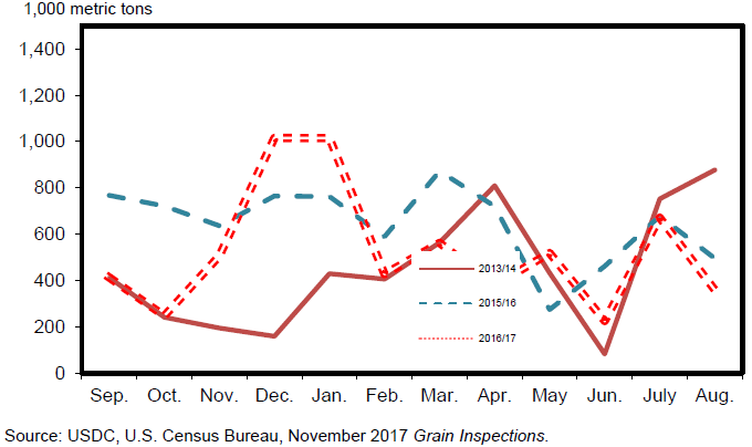 Прогнозируемая мировая торговля крупными зерновыми в 2017/18 международном торговом году (октябрь-сентябрь) увеличена в этом месяце на 1,4 млн. тонн до 188,3 млн., так как США, как ожидается, экспортируют еще больше сорго в Китай. С увеличением экспорта США прогноз мировой торговли сорго на 2017/18 год повышен на 1,3 млн. тонн до 8,4 млн. Прогноз импорта в Китай повышен на те же 1,3 миллиона тонн до 6,3 миллионов, исходя из темпов поставок и продаж. Импорт сорго в Китай поддерживается высоко конкурентными ценами на импортируемый сорго по отношению к кукурузе внутреннего производства и отсутствием торговых ограничений, в отличие от импортируемой кукурузы.
