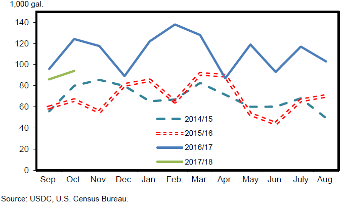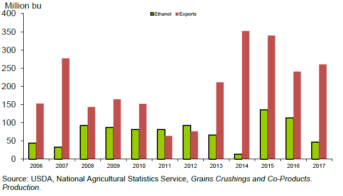 Субпродукты производства этанола являются важным источником кормов для скота и птицы как внутри страны, так и за рубежом. Кукурузная сушеная барда (DDGS), кукурузный глютеновый корм (CGF) и кукурузная глютеновая мука (CGM) являются основными категориями субпродуктов, получаемых при производстве этанола. В течение первых 2 месяцев 2017/18 года отгрузки кормовых субпродуктов были на 2 процента выше, чем за тот же период в 2016/17 году. DDGS стал основной категорией, отгруженной в объеме 1,9 млн. тонн, что незначительно ниже по сравнению с прошлым годом. Наиболее крупными покупателями стали Мексика, Турция, Индонезия и Южная Корея. Поставки CGM были на 1 процент меньше, чем в сентябре-октябре 2016 года и составили 104 000 тонн. Индонезия, Египет, Колумбия и Канада были основными направлениями поставок. Поставки CGF достигли 272 000 тонн, увеличившись на 47 процентов. Основными направлениями поставок были Ирландия, Турция, Израиль и Великобритания.