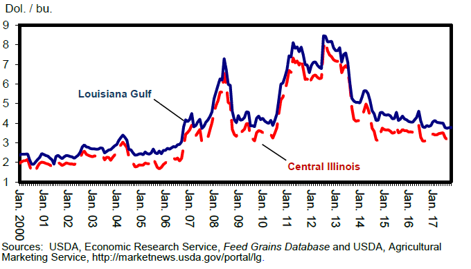 Совокупный объем прогнозируемого экспорта сорго из США на 2017/18 год увеличен на 50 миллионов бушелей. В результате прогноз использования кукурузы для производства этанола повышен на 50 миллионов бушелей до 5 525 миллионов. Цены на кукурузу, сорго и овес не изменяются по сравнению с прошлым месяцем. Цена на ячмень снижена на 10 центов за бушель до 4,50 долл. США, на основе последних рыночных тенденций.