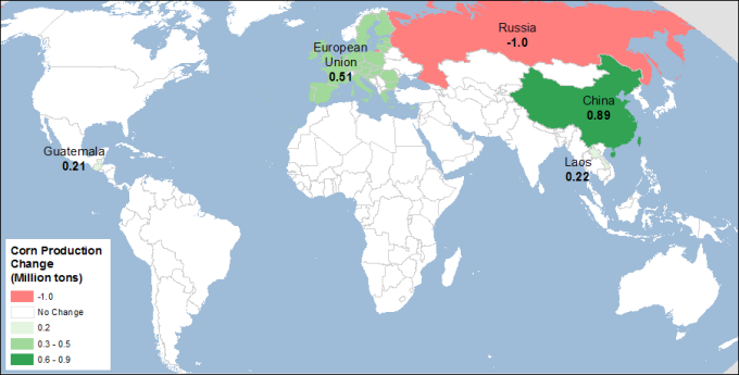 Карта 1. Изменения производства кукурузы для 2017/18 МГ, декабрь 2017 (млн. тонн)