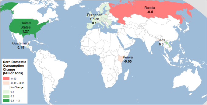 Карта 2. Изменения потребления кукурузы на 2017/18 МГ, декабрь 2017 (млн. тонн)