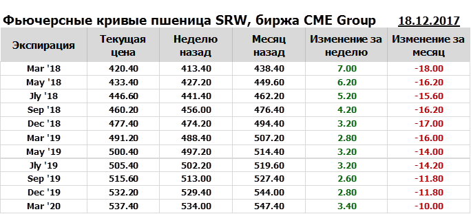 На 18.12.2017 стоимость пшеницы SRW на бирже CME Group по контракту Mar’18 составила 420.4 цента за бушель. За прошедшую неделю стоимость пшеницы SRW выросла на 7 центов/бушель.