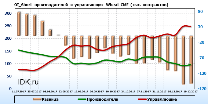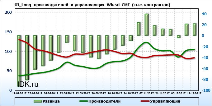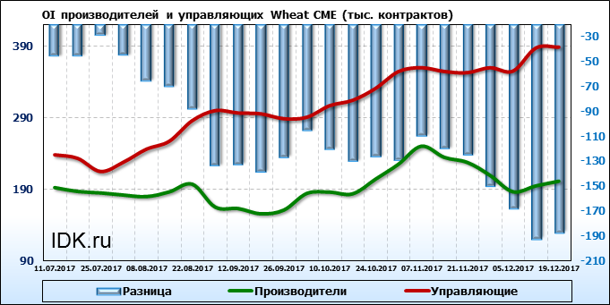 За прошедшую неделю разница между OI производителей и OI управляющих выросла на 5 035 контрактов. Разница между длинными позициями производителей и управляющих выросла на 945 контрактов. Разница между короткими позициями производителей и управляющих выросла на 3 175 контрактов.