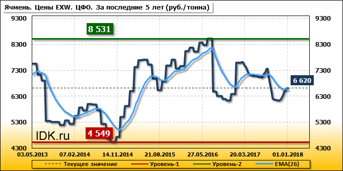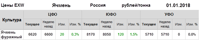 За прошедшую неделю с 25 по 29 декабря 2017 года в Центральном федеральном округе внутренние цены ячмень выросли на 20 руб./т. и на данный момент составляют 6 620 рублей за тонну.
