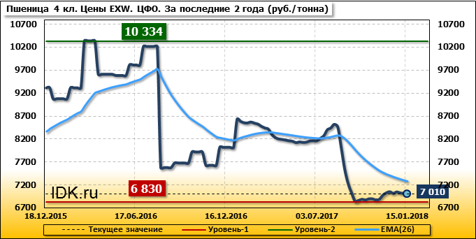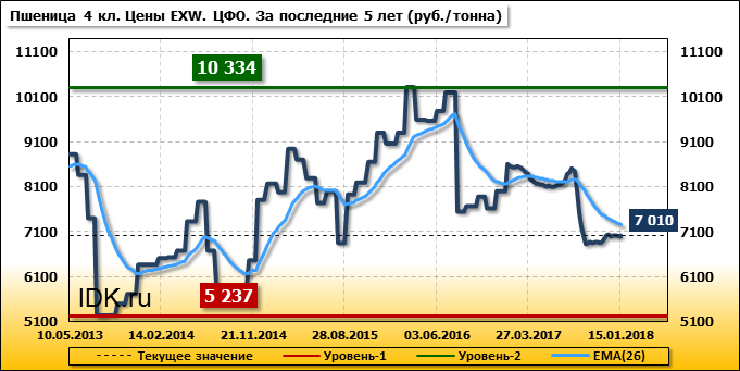 Цены на пшеницу 4-го класса поднялись на 10 руб./т. и на данный момент составляют 7 010 рублей за тонну.