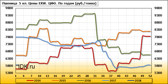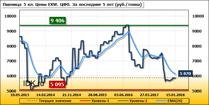 Цены на пшеницу 5-го класса повысились на 5 руб./т. и на данный момент составляют 5 870 рублей за тонну.