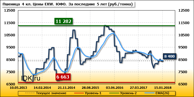 Цены на пшеницу 4-го класса поднялись на 30 руб./т. и на данный момент составляют 8 400 рублей за тонну.
