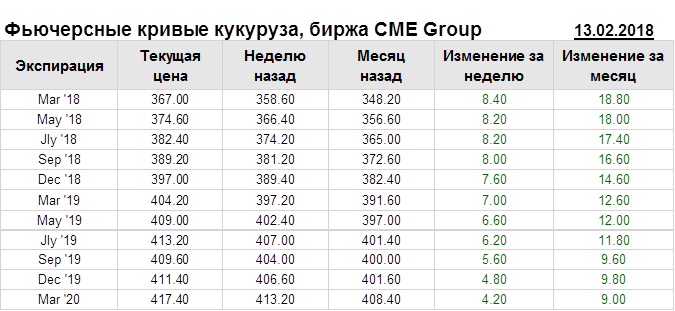 На 13.02.2018 стоимость кукурузы на бирже CME Group по контракту Mar ’18 составила 367 центов за бушель. За прошедшую неделю стоимость кукурузы на площадке CME Group выросла на 8.4 цента/бушель. Как мы видим на графике, фьючерсная кривая имеет периоды, когда более дальний фьючерс дешевле ближнего.