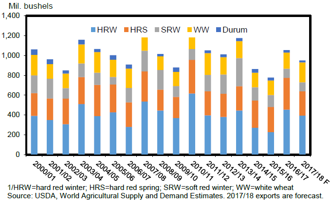 Конкуренция со стороны Канады на ключевых азиатских рынках остается сильной, и Аргентина подтверждает свою конкурентоспособность на бразильском и африканском рынках пшеницы. Соединенные Штаты также уступили Франции долю на рынке Марокко. Мировые запасы пшеницы в изобилии, а доля США в мировой торговле продолжает падать. Экспорт США в 2016/17 году превысил текущий прогноз на 2017/18 год более чем на 100 миллионов бушелей.