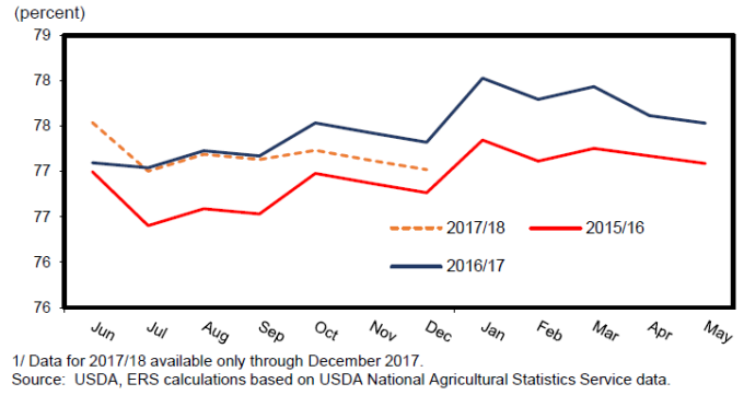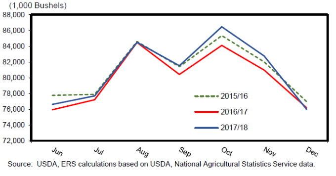 1 февраля Министерство сельского хозяйства США выпустило ежеквартальный отчет о мукомольных продуктах, предоставив данные по декабрь 2017 года. На основе данных по мукомольному производству, доступных для 7 месяцев 2017/18 года, расчетное продовольственное потребление пшеницы на 6 миллионов бушелей превышает показатель по аналогичному периоду предыдущего года (см. рисунок 2). Общий объем продовольственного потребления на весь 2016/17 год составил приблизительно 949 миллионов бушелей, что представляет собой второй подряд год падения показателя, несмотря на растущее население США. В текущем маркетинговом году наблюдается некоторый подъем, причем потребление только в декабре оказалось ниже аналогичного показателя 2016 года. Снижение было ожидаемо и сопряжено с ценовым ралли в конце лета / начале осени. Ралли было спровоцировано предполагаемым дефицитом запасов высокопротеиновой пшеницы. Даже с учетом декабрьского снижения, если последние 5 месяцев маркетингового года будут соответствовать уровню потребления прошлого года, общий объем продовольственного потребления пшеницы в 2017/18 году составит 985 миллионов бушелей.