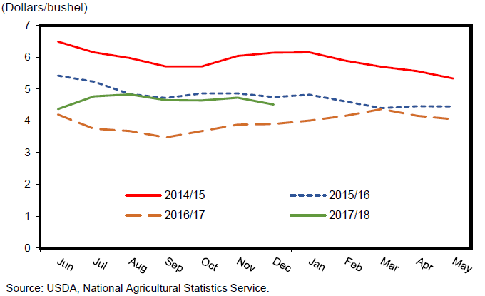 Большая часть урожая пшеницы 2017/18 была продана, а недавнее повышение цен, которое в значительной степени соответствует сезонной схеме ценообразования, не достаточно, чтобы сместить среднесезонную фермерскую цену (SAFP) с текущего прогнозируемого уровня в 4,60 доллара США за бушель (см. рисунок 4). Тем не менее, диапазон цен на всю пшеницу сужен до $4,55 – $4,65 за бушель.