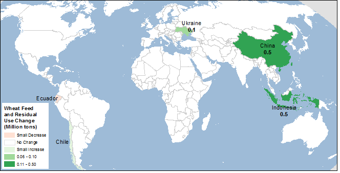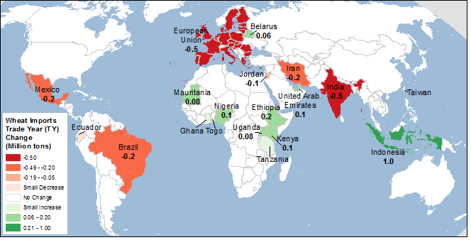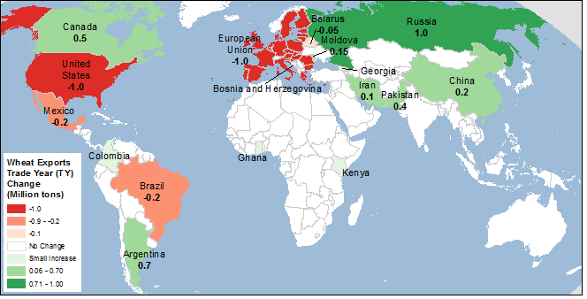 Прогноз экспорта пшеницы для Европейского Союза (ЕС) снижен на 1,0 млн. тонн до 26,0 млн. Второй подряд год низкого уровня запасов, сильный евро (что снижает конкурентоспособность европейской пшеницы на мировых рынках) и сильная конкуренция (в основном со стороны российской пшеницы), которая вытесняет ЕС с традиционных для нее европейских экспортных рынков (Египет, Кения, Уганда в Африке, Вьетнам в Азии и многие другие), все это способствует сокращению экспорта пшеницы из ЕС. Все изменения экспорта пшеницы, произведенные в этом месяце изображены на карте 2.