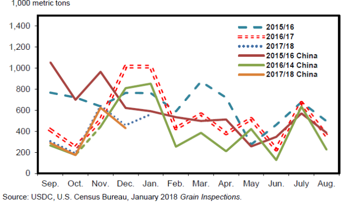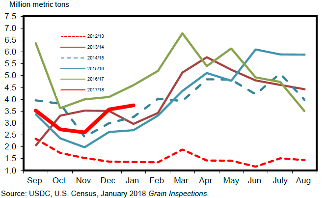 Прогноз экспорта кукурузы из США на 2017/18 международный торговый год (октябрь-сентябрь) повышен на 3,0 млн. тонн до 51,5 млн. Для местного маркетингового года (сентябрь-август) экспорт повышен на 125 миллионов бушелей (или 3,2 миллиона тонн) до 2 050 миллионов (52,1 миллиона тонн). Снижение конкуренции со стороны южноамериканского и украинского экспорта и более высокий мировой спрос на кукурузу поддерживают экспортные перспективы США, повышая ее конкурентоспособность по цене по сравнению с другими крупными экспортерами кукурузы. За последние несколько недель отсроченные продажи кукурузы соответствовали прошлогодним, а по состоянию на 1 февраля 2018 года достигли 19,2 млн. тонн, что почти на 6 процентов меньше, по сравнению с 2016/17 годом. Отсроченные продажи являются показателем того, что темпы поставок кукурузы в течение следующих 3 месяцев (с февраля по апрель 2018 года) будут активными, но не такими стабильными, как за тот же период предыдущего года, когда в Южной Америке (Бразилии) были низкие запасы после неудачного года. Во второй половине как торгового, так и местного маркетингового года поставки кукурузы из США по-прежнему будут сталкиваться с жесткой конкуренцией с со стороны аргентинской кукурузы поздней посадки (прогноз по которой, тем не менее, снижен в этом месяце) и потенциально крупного второго урожая кукурузы в Бразилии.