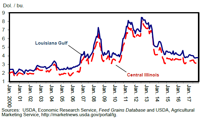 Прогнозируемый экспорт кукурузы из США на сезон 2017/18 был увеличен на 125 миллионов бушелей в этом месяце до 2050 миллионов. Кукуруза США конкурентоспособна по цене по сравнению с кукурузой других крупных поставщиков. Кроме того, экспортные перспективы для Аргентины и Украины снижены, что расширяет возможности для поставок США.