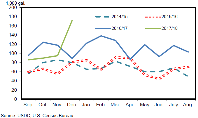 Экспорт топливного этанола в период с сентября по декабрь 2017/18 составил 436,3 млн. галлонов, что несколько превышает показатель за аналогичный период прошлого года. Китай закупил 22 миллиона галлонов в декабре, что помогло увеличить экспорт в этом месяце до самого высокого уровня в этом году. Бразилия, крупнейший импортер этанола из США, в этом году закупила 109 миллионов галлонов, причем половину этого объема – в декабре. В прошлом году правительство Бразилии объявило о введении тарифного квотирования на импорт этанола, по условиям которого импорт более 600 миллионов литров подлежит 20-процентному тарифу. Этанол в США имеет настолько низкую стоимость, что он по-прежнему является экономичной альтернативой для Бразилии, особенно в ее северных регионах.