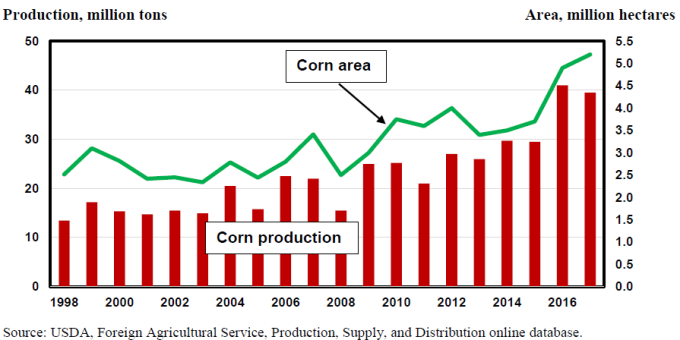 Рисунок 7. Площадь кукурузы увеличилась, но урожай сезона 2017/18 снижен.