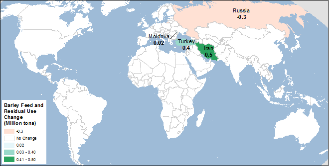 Карта 2. Изменения кормового и остаточного использования ячменя на 2017/18 МГ, февраль 2018 (млн. тонн)
