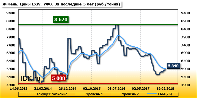 Внутренние цены на ячмень в Уральском федеральном округе выросли на 5 руб./т и на данный момент составляют 5 840 рублей за тонну.