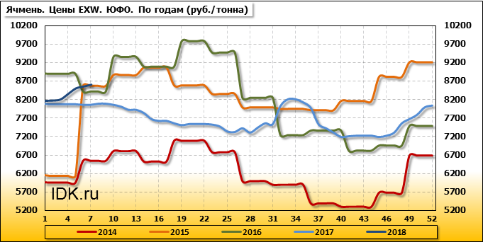 В Южном федеральном округе внутренние цены на ячмень выросли на 50 руб./т и на данный момент составляют 8 600 рублей за тонну.