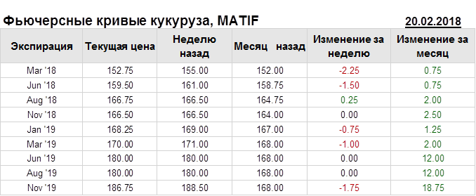 На 20.02.2018 стоимость кукурузы на бирже MATIF по контракту Mar ’18 составила 152.75 евро за тонну. За прошедшую неделю стоимость кукурузы на европейской площадке упала на 2.25 евро/тонна. Как мы видим на графике, фьючерсная кривая имеет периоды, когда более дальний фьючерс дешевле ближнего. Состояние бэквардации наблюдаем на следующих контрактах: Nov ’18. Таким образом, трейдеры предполагают, что возможно превалирование предложения над спросом в указанные периоды.