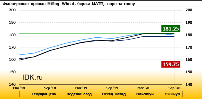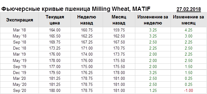 На 27.02.2018 стоимость пшеницы Milling Wheat на бирже MATIF по контракту Mar ’18 составила 164 евро за тонну. За прошедшую неделю стоимость пшеницы Milling Wheat выросла на 3.25 евро/тонна. Как мы видим на графике, фьючерсная кривая имеет периоды, когда более дальний фьючерс дешевле ближнего. Состояние бэквардации наблюдаем на следующих контрактах: Sep ’19, Sep ’20. Таким образом, трейдеры предполагают, что возможно превалирование предложения над спросом в указанные периоды.