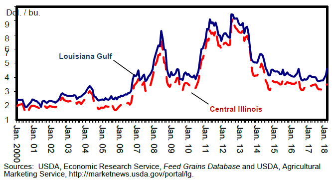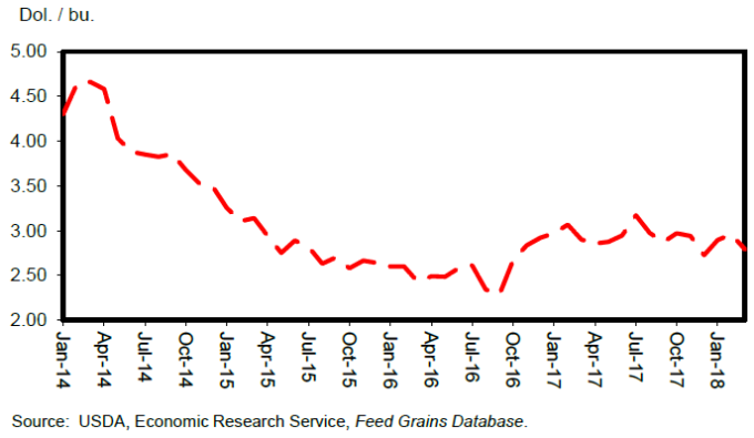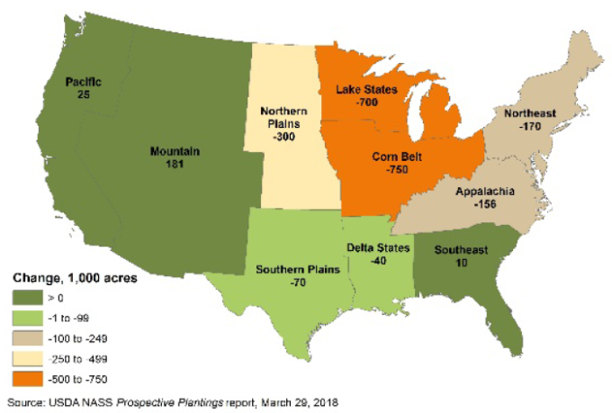 Отчет о перспективах посевов Национальной сельскохозяйственной статистической службы Министерства сельского хозяйства США (NASS) указывает на снижение посевной площади кукурузы на 2,1 млн. акров в 2018/19 году до 88,0 млн. акров на основе исследования, проведенного в период с 27 февраля по 19 марта. Соотношение цен побудило производителей перейти на такие культуры как яровая пшеница и хлопок. Среди отдельных штатов наибольшее снижение наблюдается в Миннесоте, Индиане, Иллинойсе и Северной Дакоте (некоторые из этих штатов засеяли больше пшеницы, но не увеличивали площадь сои).