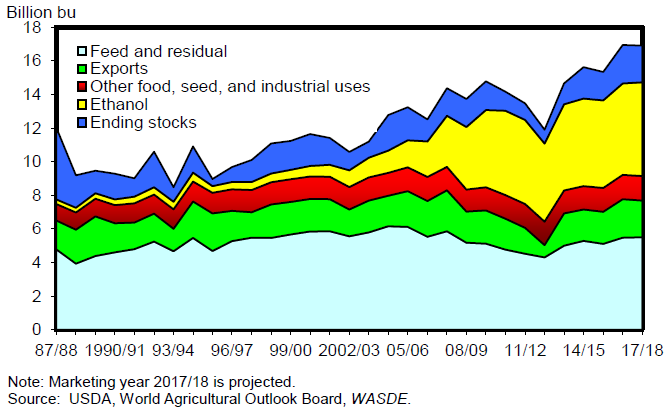 В течение первой половины 2017/18 года оцениваемое кормовое и остаточное потребление кукурузы составляло 3 755 млн. бушелей, по сравнению с 3 803 млн. в первые 6 месяцев 2016/17 года. С 2011/12 по 2015/16 год кормовое и остаточное потребление в первом полугодии составляло в среднем около 72 процентов от общего объема. Прогноз кормового и остаточного использования для маркетингового года снижен в этом месяце на 50 млн. бушелей до 5 500 млн.