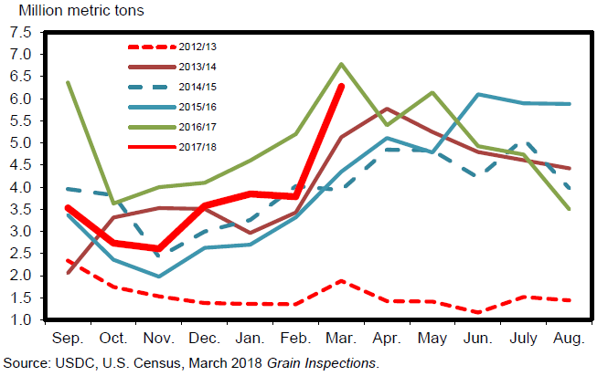 Прогнозируемый экспорт в этом месяце не изменился и составил 2 225 миллионов бушелей. Итоговое использование составляет 14 765 млн. бушелей, что на 55 миллионов меньше, чем прогнозировалось в прошлом месяце, и на 116 миллионов меньше, чем в 2016/17 году. При неизменном уровне предложения и снижении потребления, прогнозируемые переходящие запасы повышены на 55 миллионов бушелей до 2 182 миллионов бушелей, что в случае реализации прогноза, станет снижением на 111 миллионов бушелей с 2016/17 года. Коэффициент использования запасов кукурузы прогнозируется на уровне 14,8, по сравнению с 14,4 в прошлом месяце и 15,7 в 2016/17 году. Экспорт этанола в США установил рекорд в 219 миллионов галлонов в феврале, при этом почти половина его пришлась на Бразилию.
