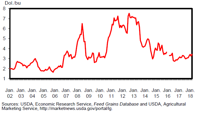 Прогнозируемый диапазон цен на кукурузу, полученных фермерами, сужен на 0,05 доллара США на каждом конце диапазона до $3,20 — $3,50 за бушель, при средней цене 3,35 долл. США за бушель без изменений по сравнению с прогнозом прошлого месяца.