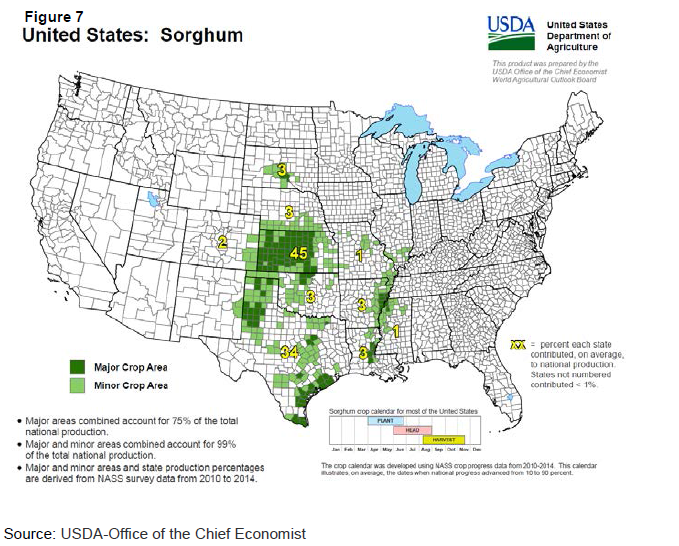 В отчете Nass’s Prospective Plantings сообщается, что производители намерены увеличить посевную площадь сорго в 2018/19 году на 5 процентов, или 306 000 акров, до 5,932 миллиона акров, по сравнению с предыдущим годом. Большая часть увеличения обусловлена расширением площадей в Техасе, Миссури, Небраске, Оклахоме и Южной Дакоте. Хотя в отчете представлено общее увеличение площадей для Соединенных Штатов, в Техасе, лидирующем штате по производству сорго, прогнозируется один из самых низких показателей по площади, меньше были лишь 1,550 млн. акров в 2011 году.