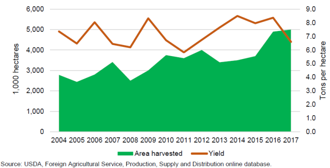 В случае реализации прогноза уборочная площадь кукурузы в Аргентине в 2017/18 году по-прежнему останется рекордно большой. За последние 15 лет площадь кукурузы росла стабильно, но медленно. Но после проведения рыночной реформы рост площади кукурузы в стране ускорился: в результате текущая площадь кукурузы почти вдвое превышает показатель 2004-05 года, в то время как тенденция урожайности кукурузы не впечатляет (рисунок 9).