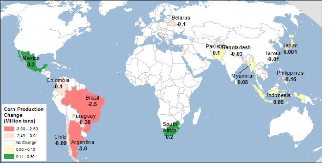 Основным фактором изменений мирового баланса кукурузы в этом месяце является сокращение производства кукурузы в южноамериканских странах – Аргентине, Бразилии и Парагвае. Сокращение производства кукурузы в Южной Америке повышает ценовую конкурентоспособность США и, как ожидается, будет поддерживать более высокие темпы экспортных продаж и поставок кукурузы во второй половине 2017/18 года.