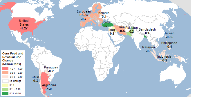 Несколько изменений, отражающих пересмотры производства, перераспределения среди видов зерна, макроэкономическую ситуацию и многочисленные изменения в торговле между странами-импортерами и экспортерами кукурузы, стали причинами корректировок в этом месяце. Львиная доля снижения потребления за пределами США приходится на кукурузу – на 3,8 млн. тонн; потребление ячменя и сорго уменьшилось на 0,3 млн. тонн для каждого, овса и ржи – на 0,1 млн. тонн. Наибольшая доля снижения потребления кукурузы приходится на Аргентину – на 1,2 миллиона тонн, как результат резкого сокращения урожая в этом месяце, которое, как ожидается, будет способствовать повышению внутренних цен и сокращению кормового использования. В некоторых странах соотношение цен делает пшеницу более предпочтительной, чем кукуруза, для использования в качестве корма, а увеличение использования пшеницы ограничивает использование кормового зерна. Например, кормовое использование кукурузы в ЕС сокращено на 0,7 млн. тонн, что частично компенсирует увеличение кормового использования пшеницы на 1,5 млн. тонн. В Иране прогнозируется замена кукурузы ячменем в объеме 0,5 миллиона тонн, что подтверждается данными об импорте зерна.